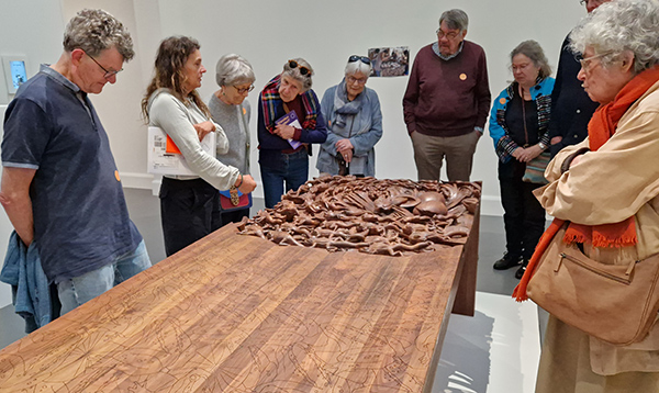 We troffen het, de gids Dieuwke van den Heuvel was zelf een van de exposerende kunstenaars. Wie beter dan zij kon ons uitleggen waar deze tentoonstelling over ging. Dieuwke vertelde ons dat we, volgens de visie van de groep van kunstenaars uit Australië, Indonesië en Nederland, op vier wijzen met onze (geboorte-)grond verbonden zijn: met de aardse grond, met de culturele grond, de gemeenschappelijke grond en met de affectie-spirituele grond (bron: Munir Fasheh). Dat zijn ook de lagen in de zeer verscheiden kunstwerken en in de tentoonstelling. Zichtbaar werden deze lagen door de overheersende aandacht die besteed werd aan koloniale aspecten, aspecten van de klimaatcrises, verschillen in volkenkundige culturen en in politieke en economische geschiedenis ter plaatse. Lang stonden we stil in elk van de tien zalen om met Dieuwke deze lagen in de getoonde kunstwerken te zoeken, te ontdekken en te bediscussiëren. Voorbij kwamen bijvoorbeeld de aardse afdrukken van de Dommel, een smeltende gletsjer, eetgewoonten en huttenbouw in Nederlands-Indië, een Brabantse melkboerderij en 33 stenen als symbool en blijvende herinnering aan misdaden tegen Aboriginals in Australië. Over alle werken werd gediscussieerd, soms in alle heftigheid, want Dieuwke stak haar visie op onze westerse maatschappij niet onder stoelen of banken; de deelnemers die van hen evenmin. Kortom, het bezoek en de rondleiding voldeden aan de verwachtingen: “het Van Abbe was weer moeilijk, maar dan heb je ook wat om nog lang over te discussiëren”, “Het was zeker geen walk over!” en “Er was nog erg mooi werk bij ook!” Kortom, en zeker achteraf, in alle opzichten werd aan onze verwachtingen voldaan. André Meijer
