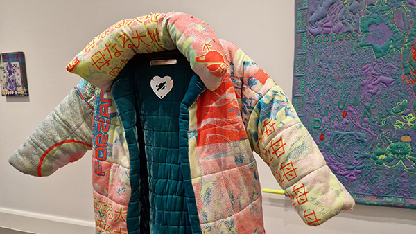 Van Tony Cragg zagen we bij het thema ‘to care for materials and resources’ een kleurrijk kunstwerk van samengesteld recycle-materiaal. Boeiend was een zaal vol designopstellingen in relatie tot de natuur. Daar werd met kleuren en geuren gewerkt, of werden verborgen geluiden uit de natuur opgewekt. Mijn favoriete zaal met het thema ‘to feel acknowledged’ was die met onder andere de prachtige recycle-jas ‘Cocoon’ van Yanna Forzani. Daar zou je toch graag helemaal in verdwijnen of in gezien willen worden. Ook een wandkleed van haar was schitterend.
