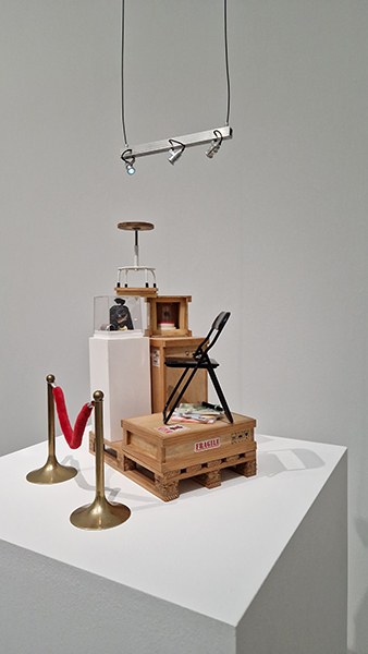 Daarna kregen we in de grote zaal een aantal verweerde schaalmodellen te zien van iconische bouwwerken als de Arc de Triomphe en de Tower Bridge, die Rapaela Vogel had aangekocht van een verlopen pretpark. Hier stelde Raphaela de oude westerse idealen ter discussie. Op een groot beeldscherm filmde Raphaela zichzelf wanneer ze in een hijskraan klimt.