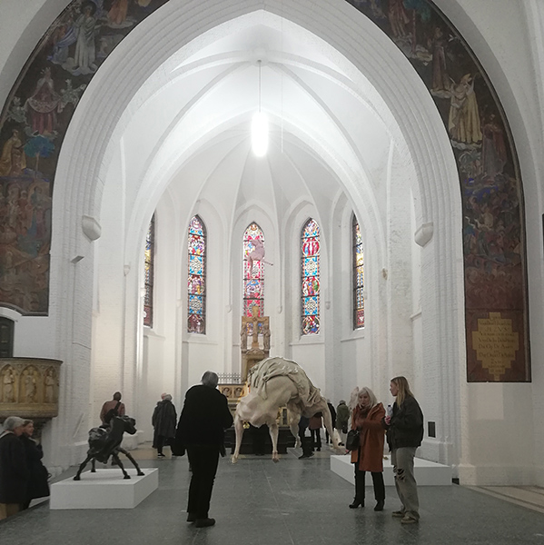 Een andere kunstenaar Gino Lucassen, heeft zich afgevraagd hoe geweld is ontstaan en waarom het zo’n grote rol speelt in onze maatschappij. Op internet zijn er erg veel negatieve reacties, hoe ontstaat dat? Waar is ons moreel kompas gebleven? Ook dieren doen we dit aan. Dit is te zien in de sculpturen midden voor het altaar.